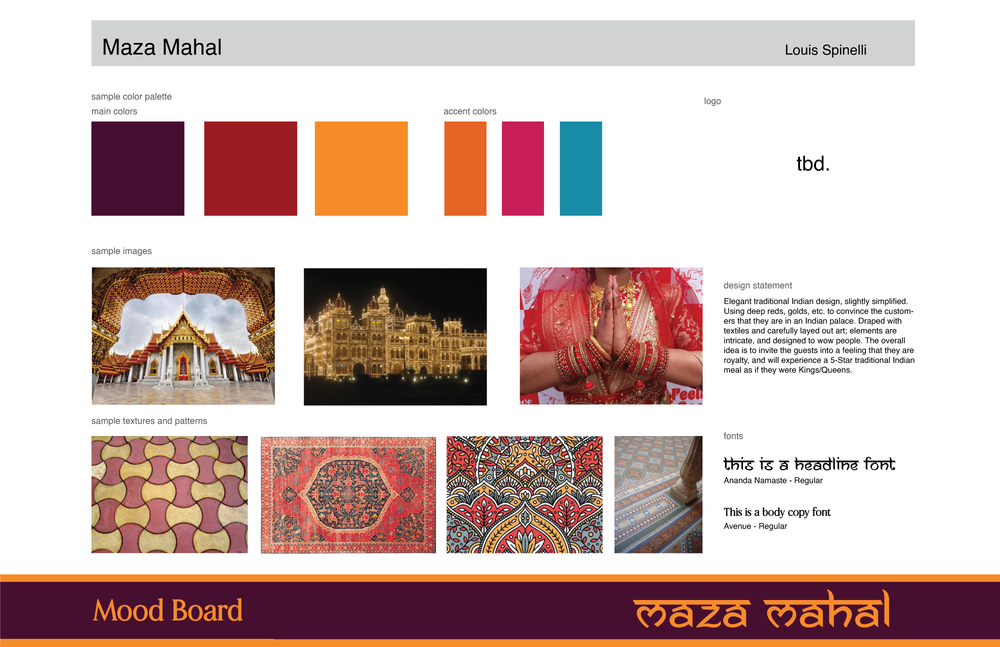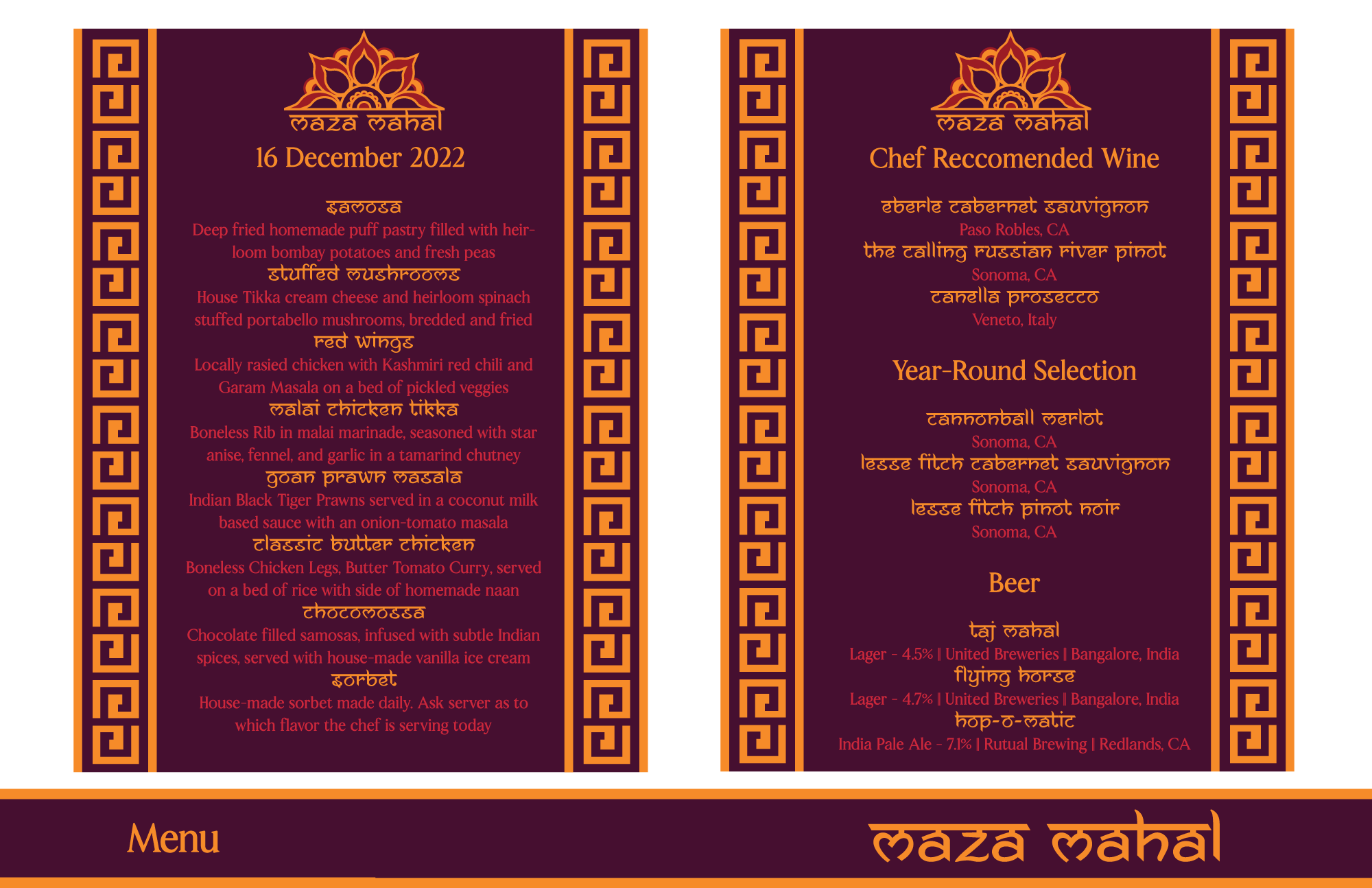 This project was done by creating marketing for a fake restaurant that was randomly chosen; in this case, it was Maza Mahal, an exciting 5-star Indian Restaurant. This was all created solely on Adobe Illustrator.